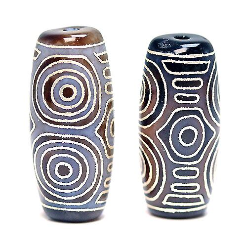 瑪瑙、玉髄、カーネリアンなどに特殊秘法の腐食加工を施し、染料を浸透させて、仏教的紋様を高温で焼き付けて作ります。仏の加護を得て、運勢を強化したい方に多く親しまれています。