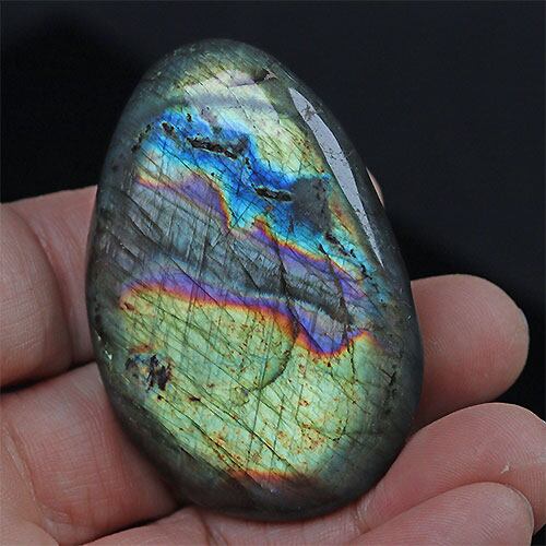 光にかざすと青やオレンジ、黄色など虹色の美しく輝く石。