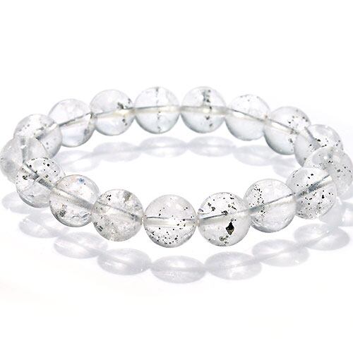 滅多に入荷のない貴重なパイライトインクォーツブレスレットです。透明度が極めて高い水晶の中に、キューブ状のパイライト結晶が美しく輝いています。通常、同じ成分であっても、このような形状のパイライト結晶が水晶内に見られることは非常にまれです。これは、水晶が成長する過程で、パイライトが水晶内に取り込まれる、特別な条件下でしか生まれない超希少石です。♪♪